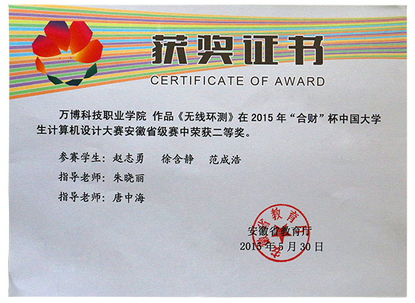 2015中国大学生计算机设计大赛安徽省级赛(含计算机设计、程序设计♝🧑🏻🦼、单片机🙆🏼♂️、机器人四个赛项)已经结束。由2013级计算机网络技术专业赵志勇、徐含静、范成皓三位同学在唐中海、朱晓丽两位老师的指导下完成的参赛项目《无线环测》荣获2015年“合财”杯中国大学生计算机设计大赛安徽省级赛二等奖的好成绩🧍🏻,由2013级通信技术专业郑羡羡、2013级应用电子技术专业王庭伟组成的彩神Vll学院代表队在“炜煌杯”2015安徽省大学生单片机应用技能竞赛上同样表现不俗,在桂冰♥︎、程宇林两位老师的指导下最终荣获三等奖的好成绩🚏。此外,我院提交的《企业内部办公系统》、《人机对话》等作品荣获大赛5项优胜奖以及1项参赛奖。