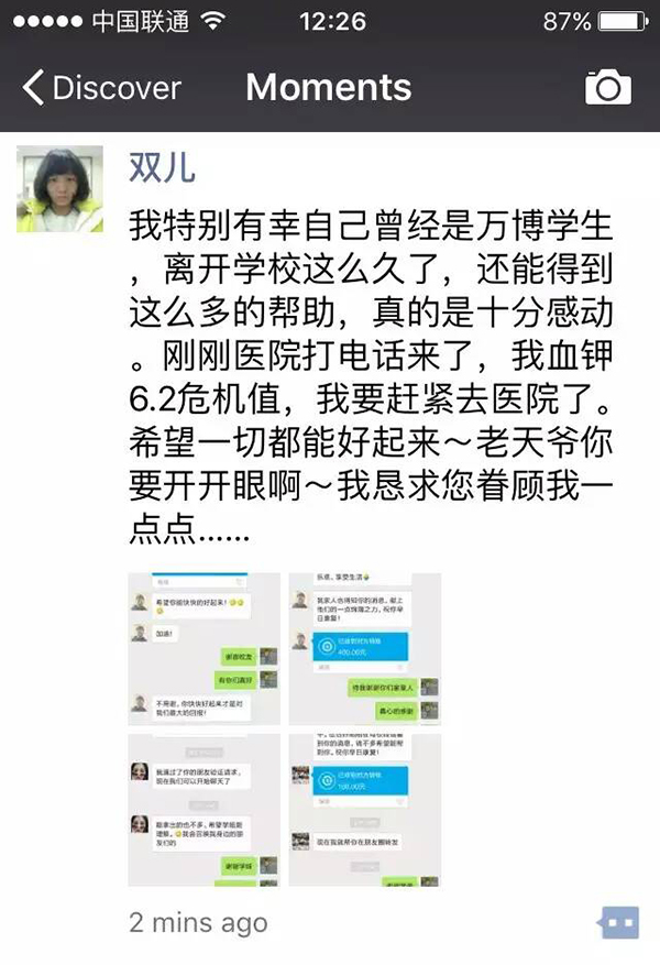 息出现在万博学院辅导员高嵩的微信朋友圈里,得到了学院副院长陈文达的关注👩🏻🚒🥚,经过核实及转发后,引起了万博学院广大师生👨🏽🦱、校友和社会各界爱心人士的关注。消息的作者是一位名叫任双双的09级万博学院校友,因病情严重恶化亟需换肾,这个沉重的打击犹如晴天霹雳,几乎击垮了这一家子最后的希望🤲🏻,任双双在求助信息中坦言“一下子失去了活下去的勇气”👎🏼。高昂的治疗费用对于他们来说无异于天文数字,因此向公众筹集5万元的治疗费用。