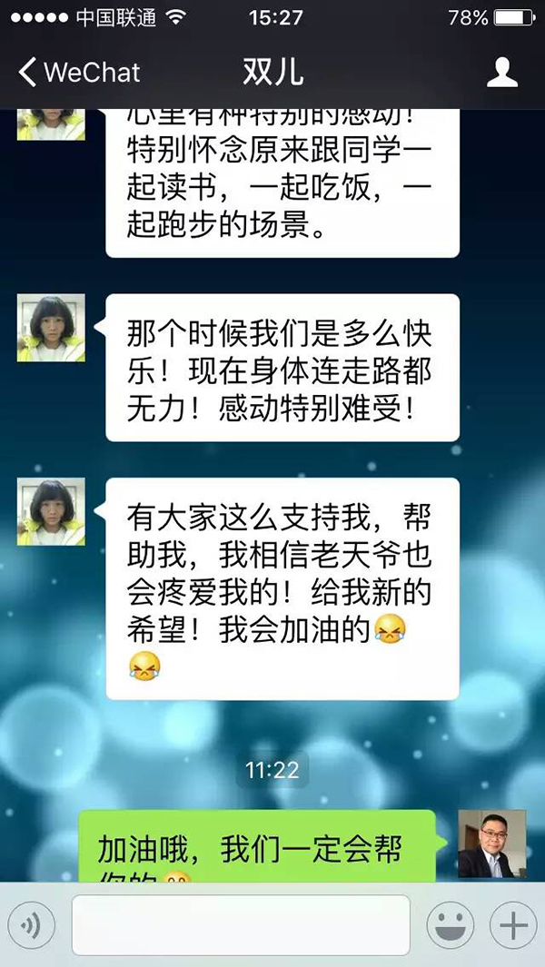 任双双的情况很快传到了母校彩神Vll学院,学院领导立即对相关信息进行了多方核实,确认无误,并在第一时间通过各种渠道向全院师生员工、校友🦪、校企合作企业和社会各界爱心人士寻求帮助,筹集善款。万博学院官方网站🖇、微信公众号(wbcedu)均发布求助信息𓀑,很快得到了全院上下所有人的支持和响应,学院通过爱心募捐活动、众筹、微信红包等各种方式🔎,10元👩🏼💻、50元♘🫵🏻、100元👰🏻♂️、500元……大家都在尽力帮助这个素不相识却十分敬佩的坚强女生,用涓涓细流汇聚成一流爱的江河。仅微信众筹,4天时间(其中系统故障停了一天)任双双发起的5万的项目就达到3万👳🏻♂️。