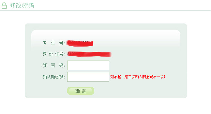 输入考生号,身份证号,点击“发送短信验证码”按钮后,系统会随机发送6位数字验证码至考生报名时所填的手机号上;填写完短信验证码👋🏽,点击“确定”📗🐉,跳转至考生修改密码页面,设置考生登录密码💟。短信验证码只能发送5次,请考生谨慎操作。