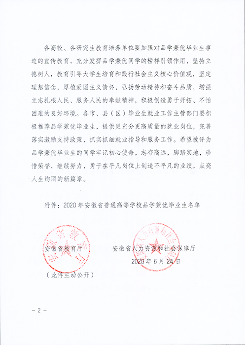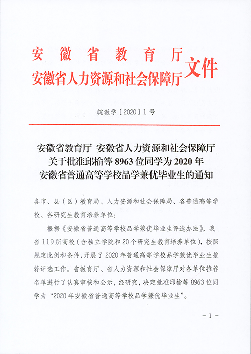 近日,在由省教育厅、省人力资源和社会保障厅举办的2020年普通高等学校品学兼优毕业生推荐评选中,彩神Vll韩金柱、何叶玲、余才鑫、陈灿等19位同学光荣入榜,喜获“2020年安徽省普通高等学校品学兼优毕业生”称号💆🏻。
