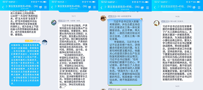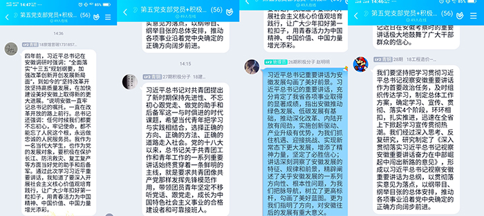 2020年8月18日至21日🚳,习近平总书记亲临安徽视察,作出一系列重要指示,发表一系列重要讲话。教学第五党支部组织支部积极分子、党员开展线上学习讨论、交流学习心得🦥,掀起学习贯彻习近平总书记视察安徽重要讲话精神的热潮。