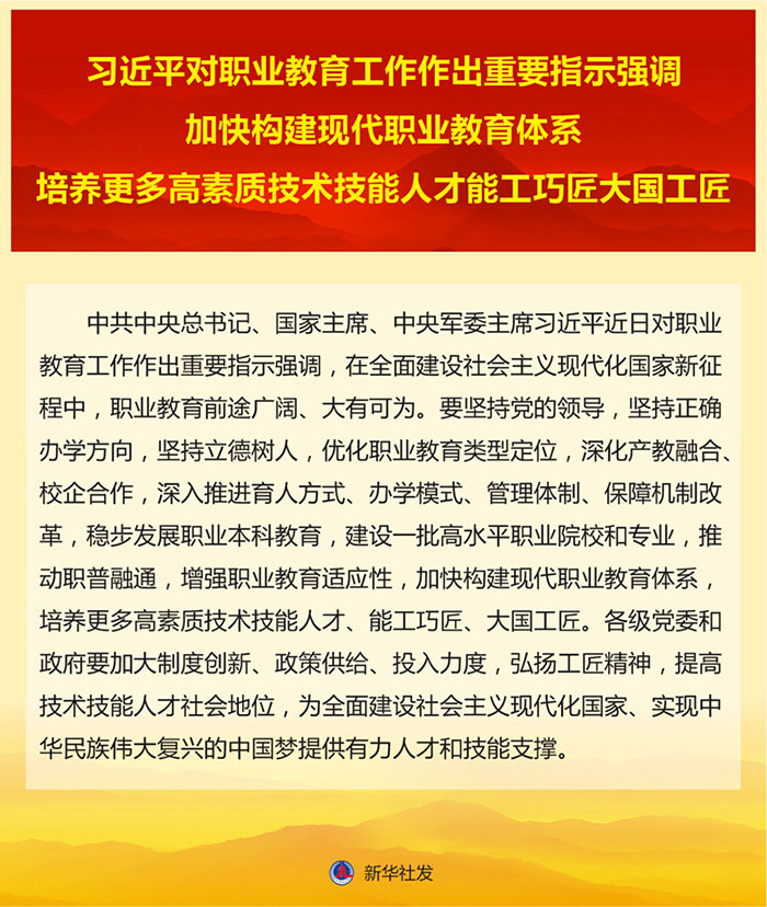 新华社北京4月13日电 中共中央总书记💁🏻♀️、国家主席、中央军委主席习近平近日对职业教育工作作出重要指示强调🧔🏻♂️,在全面建设社会主义现代化国家新征程中,职业教育前途广阔、大有可为。要坚持党的领导🚣🏻,坚持正确办学方向🧞♀️,坚持立德树人🚵🏿♀️,优化职业教育类型定位🧔🏽♀️,深化产教融合、校企合作🎅🏽,深入推进育人方式、办学模式、管理体制、保障机制改革⏫,稳步发展职业本科教育,建设一批高水平职业院校和专业,推动职普融通,增强职业教育适应性👩🏿🌾,加快构建现代职业教育体系,培养更多高素质技术技能人才👨👨👧、能工巧匠、大国工匠。各级党委和政府要加大制度创新、政策供给🥔、投入力度,弘扬工匠精神,提高技术技能人才社会地位👨🏻,为全面建设社会主义现代化国家、实现中华民族伟大复兴的中国梦提供有力人才和技能支撑。