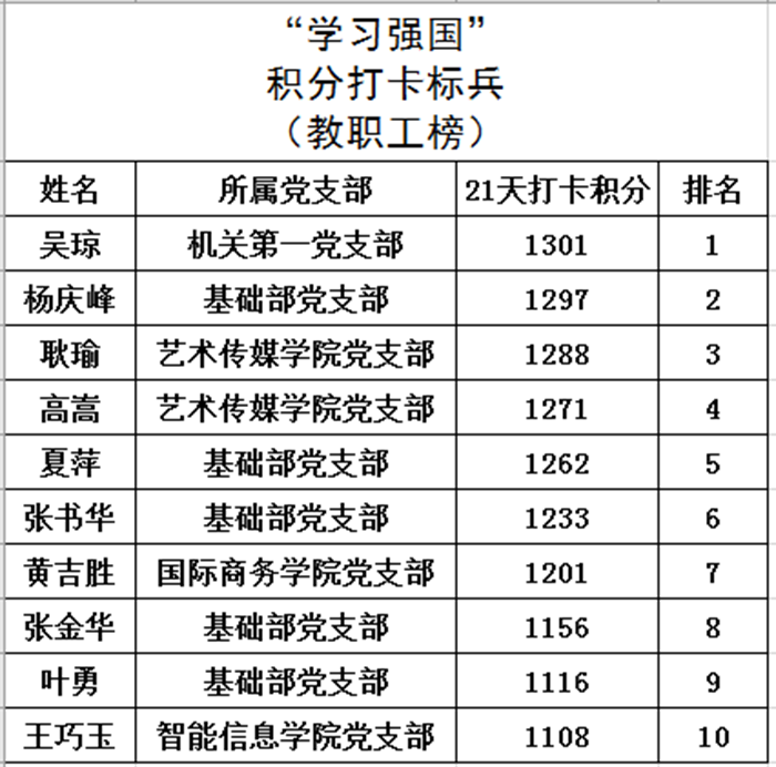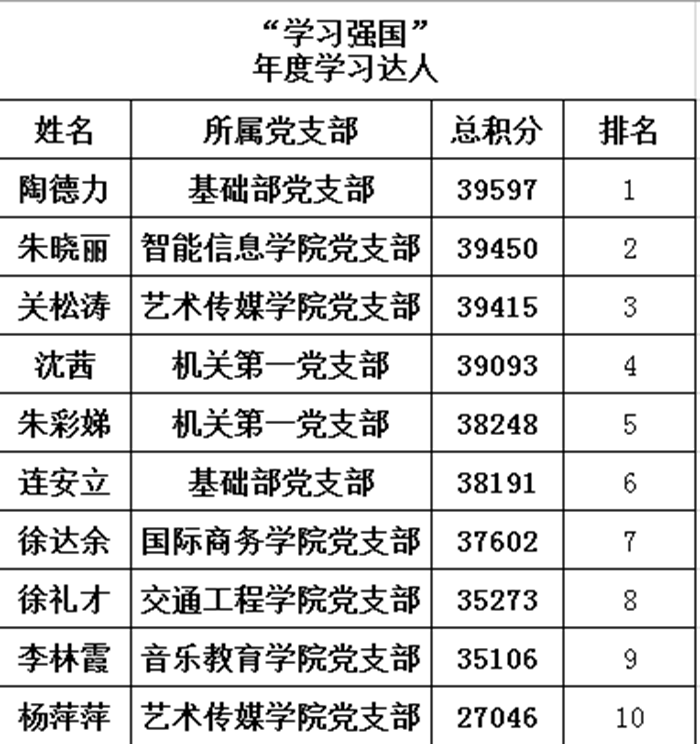 据介绍,结合“学习强国”平台,5月17日后,校党委对参赛学员的打卡期累计积分、支部学员参与度等指标进行综合考量🪀,最终确定了个人及团体获奖名单🧶,并产生“年度学习达人”称号10人,“积分打卡标兵”教职工和学生各10人,“活跃党支部”称号5个。