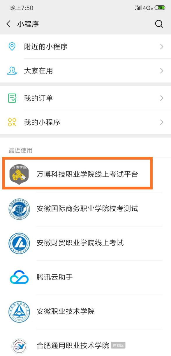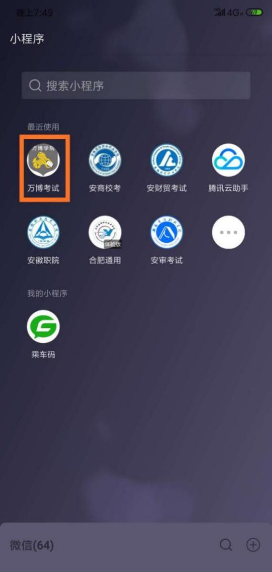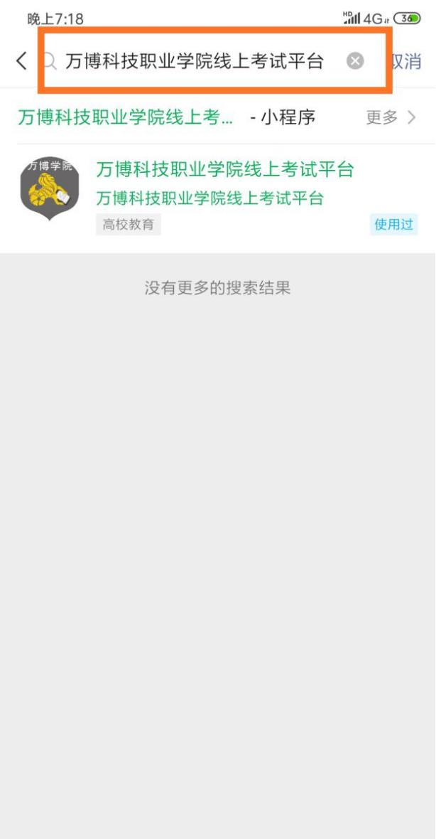 打开手机微信,在“微信”页面中下拉出现小程序查找页面或在“发现”页面的小程序菜单上,在搜索框中输入“彩神Vll学院线上考试平台”进行查询,在查询结果中点击“彩神Vll学院线上考试平台”小程序即可打开登录页面🧾,或者直接使用微信扫一扫识别二维码进入小程序;