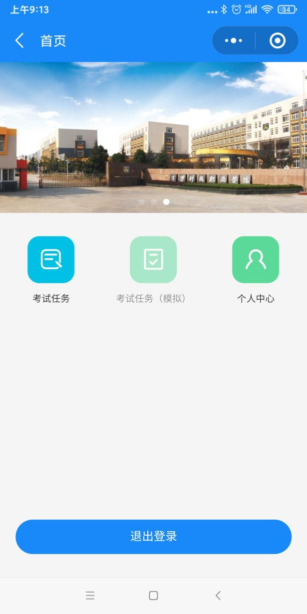 进入平台后出现三个菜单分别是考试任务、模拟考试和个人中心,在正式考试时将关闭模拟考试菜单,以避免混淆操作,个人中心展示考生基本信息和提供密码管理功能;