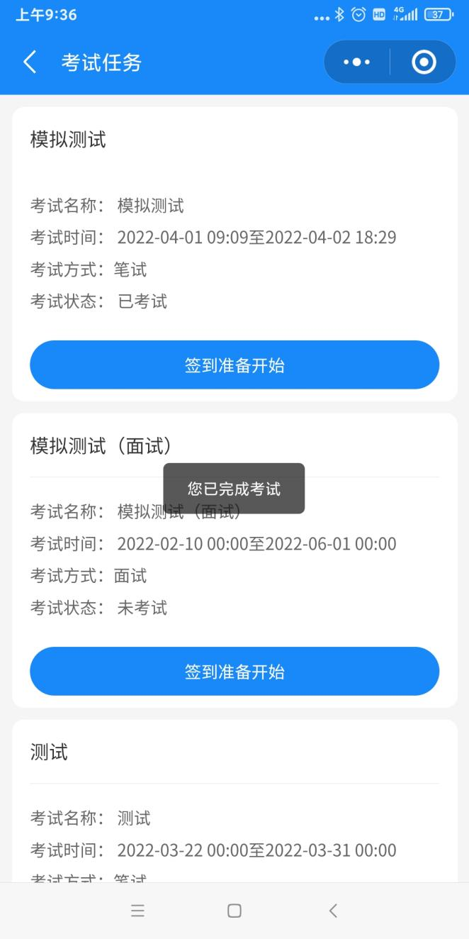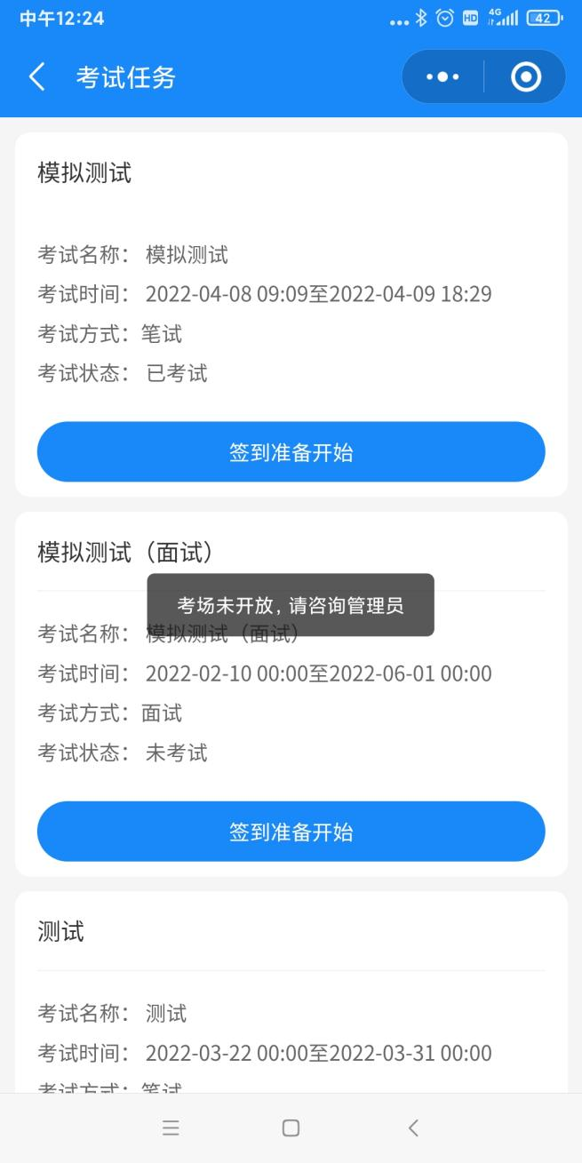 选择进入“考试任务”菜单,出现考试列表页面⚆,考生可以看到自己所对应的考试项目🤥,在考试有效时间内点击“签到,准备考试”按键进入候考页面💪🏼,如出现“考场未开放”或“已完成考试”提示时请核对考试状态与时间或联系值班监考老师🧚♀️;
