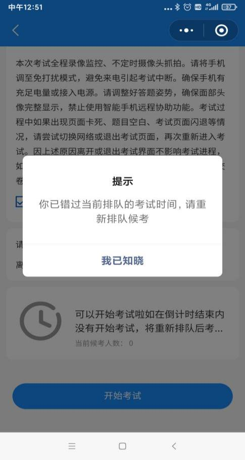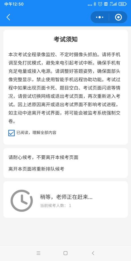 (2)非定时考试🧑🏿💼:平台自动分配考试资源🤘🏽,如果签到考生超出系统设置的人数时,新进入的考生将要进行排队候考,候考页面中有提示候考时间和排队人数🙅🏼,请考生根据实际排队长度合理安排考试时间,如果退出后重新进入候考页面时👩🏿🚀,需要重新排队🌨!