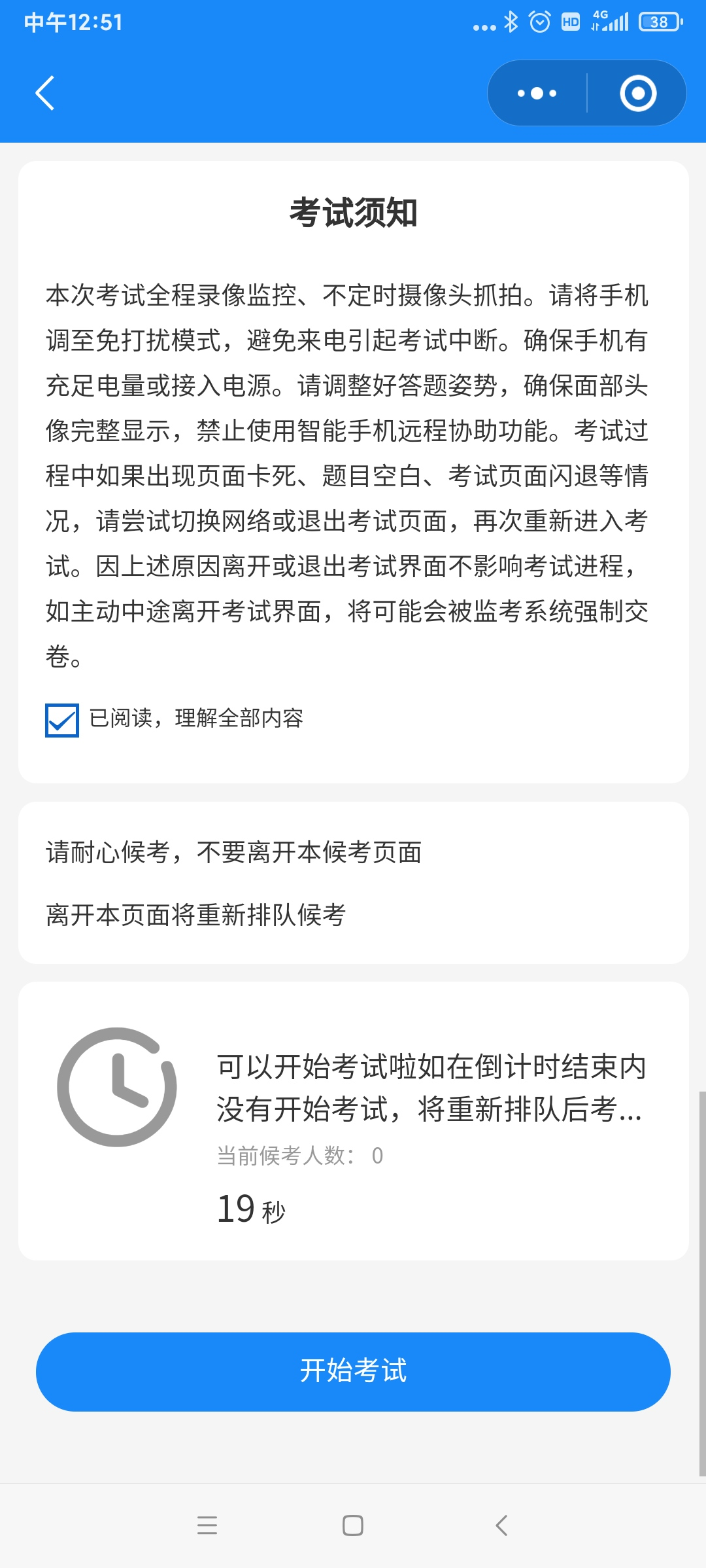考生在候考页面中排到了考试,页面上显示可以考试时🟪,点击“开始考试”即可进入考试页面,考试的试卷是按照规程随机抽取👨🏽🔬,请认真作答,考试结束后点击“交卷”也必须要再做一次人脸识别身份验证,按照系统提示操作即可👰♀️。