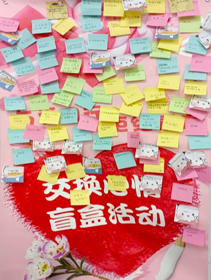 活动从交换心情🔥、才艺展现、互动游戏三个环节展开🫅🏻。同学们将烦恼粘贴在展板上🦚,并从“鼓励盲盒”中抽取一张属于自己的鼓励话语,交换自已的心情🎟,以此缓解心中的压力🎻,甩掉烦恼的包袱,把烦恼化为飞翔的动力,调整自己的心态👩。