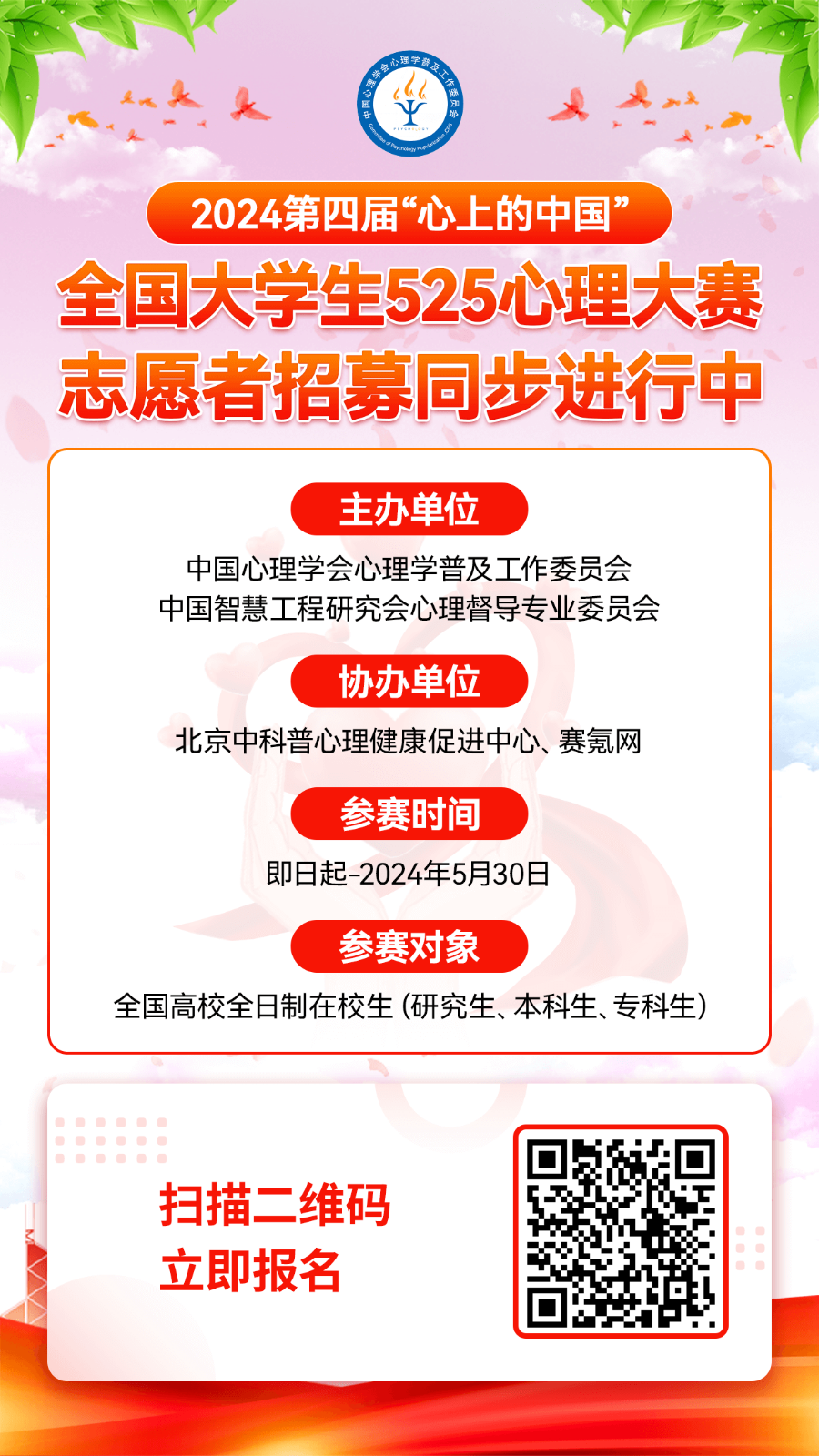为激发彩神Vll大学生积极学习心理科学知识热情🥣,培养具备心理科学素养的新时代大学生🦸🏿♀️,助力国家社会心理服务体系建设👩🏻✈️,中国心理学会心理学普及工作委员会、中国智慧工程研究会心理督导专业委员会、北京中科普心理健康促进中心计划于5.25全国大学生心理健康日即将到来之际,共同发起举办“2024第四届‘心上的中国’全国大学生525心理大赛活动”。现将有关事项通知如下☮️: