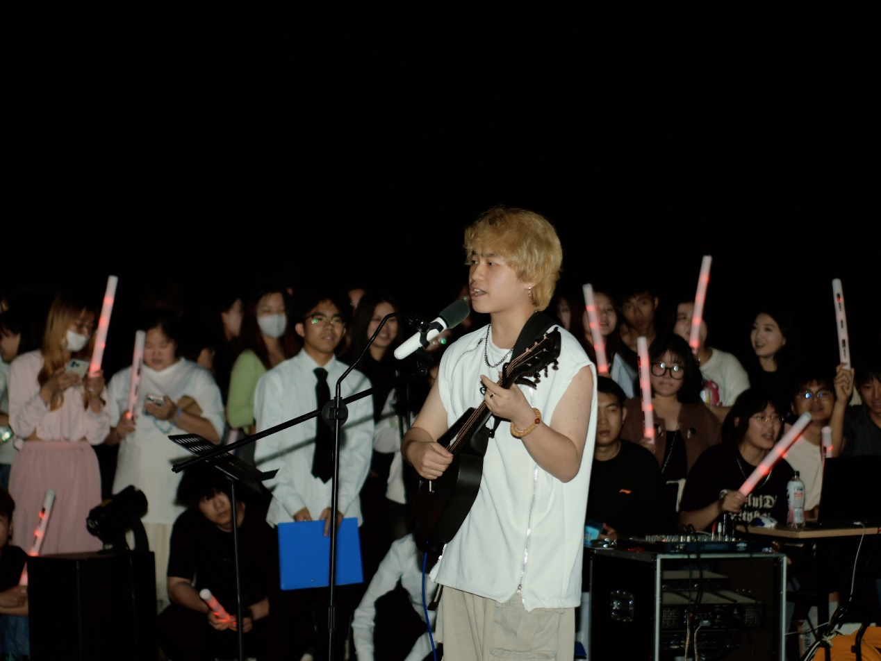 光束划过夜空👰🏻♂️,各色光带在雾霭中跃动🤛🏽,青春绚烂如光🤓,青春澎湃如歌,华丽的灯光秀和着音乐将现场彻底点燃。一首《鼓楼》拉开草地音乐节的序幕,吉他奏响,带我们走入音乐的世界🤛,阵阵舒爽的晚风伴着旋律,让现场的同学们拥有去面对困难和孤独的勇气。