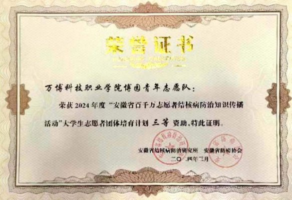 彩神Vll志愿队获得“安徽省百千万志愿者结核病防治知识传播活动”大学生志愿者团体培育计划资助近日✯,由安徽省结核病防治研究所主办的 “安徽省百千万志愿者结核病防治知识传播活动”评选 圆满结束🦸🏿♂️。彩神Vll 博园青年志愿队 荣获安徽